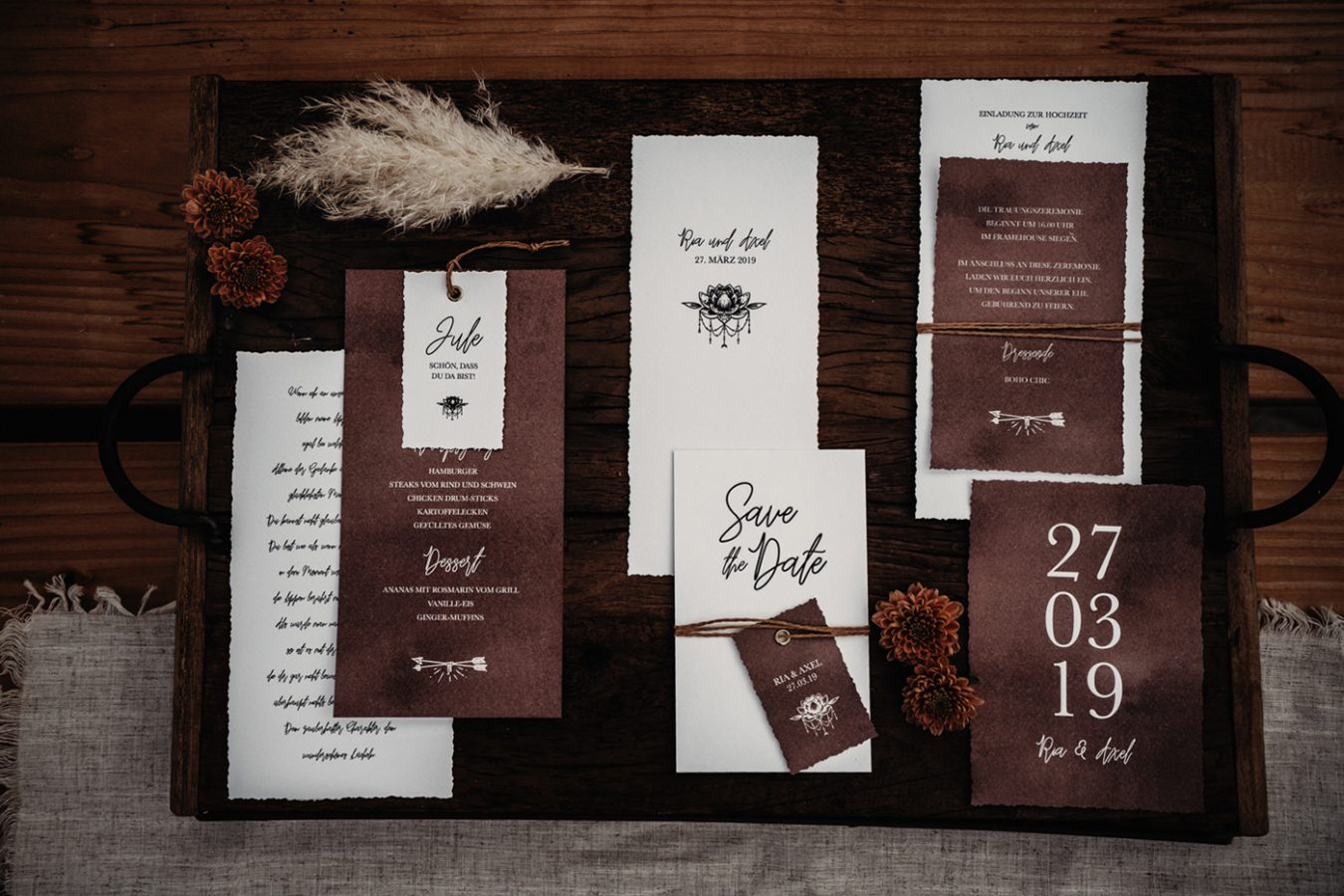Denise Perrine Design bietet euch euer ganz persönliches Karten-Set im Stil eurer Hochzeit, der Taufe eures Kindes oder eurer Geburtstagsfeier. Angefangen von Save the Date, Einladungskarte oder hochwertigen Pocketfold, bis hin zum Trauprogramm/Taufprogramm und der Dankeskarte. Gemeinsam designen wir eure individuelle Papeterie, die ganz auf eure Wünsche zugeschnitten ist. Zudem können wir eure Hochzeitsgäste überraschen. Beispielsweise mit einem passenden Sitzplan, Gastgeschenk, Sticker, Anhänger, oder auch mit Menükarten, Tischnummern und Namenskärtchen.